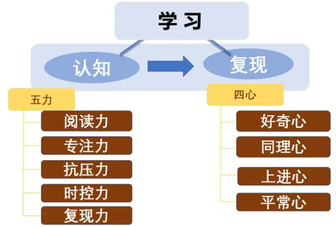关于学习有一个模型,首先学习分成两部分,第一是认知,第二是复现,左边是学习中最重要的五种能力,右边是重要的四种形态