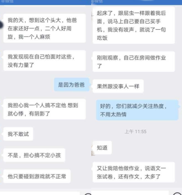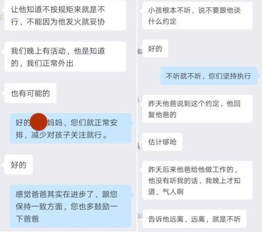 在让孩子感受到爱的同时,手机使用方面,指导老师建议开始给孩子提他能够通过尝试做到的要求。如果实在做不到,允许有一点弹性。规则约定初期,孩子做不到遵守规则约定,孩子拿不到手机和平板时,开始采取骚扰措施,制造异响震动影响妈妈睡眠,把妈妈关在门外,并以死威胁,妈妈无力不想回家,爸爸不敢面对又重新回到办公室。