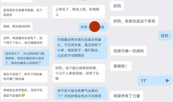 在指导老师的支持和陪伴下,妈妈力量感增加,开始严格执行规则,面对孩子的威胁冷静应对不妥协。孩子开始作息调整,情绪状态有好转现象。但此时孩子爸爸不信任指导老师的方法,急于让孩子回到学校,背着妈妈跟孩子谈交易,给孩子买手机和无人机,来换取孩子返校。孩子答应并返校,但只在学校停留一天,又回到家中,反锁房门不再上交手机和平板