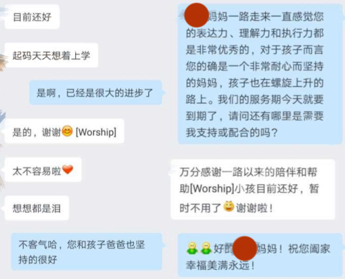 在减少关注仅保留必要关心的坚持中,孩子主动找妈妈沟通,并痛哭表示爸爸对他的伤害很大,不仅是转学的安排,还有动手冲突都太极端。老师指导孩子妈妈用共情的方式,协助疏导孩子的情绪并放下对爸爸的怨恨。